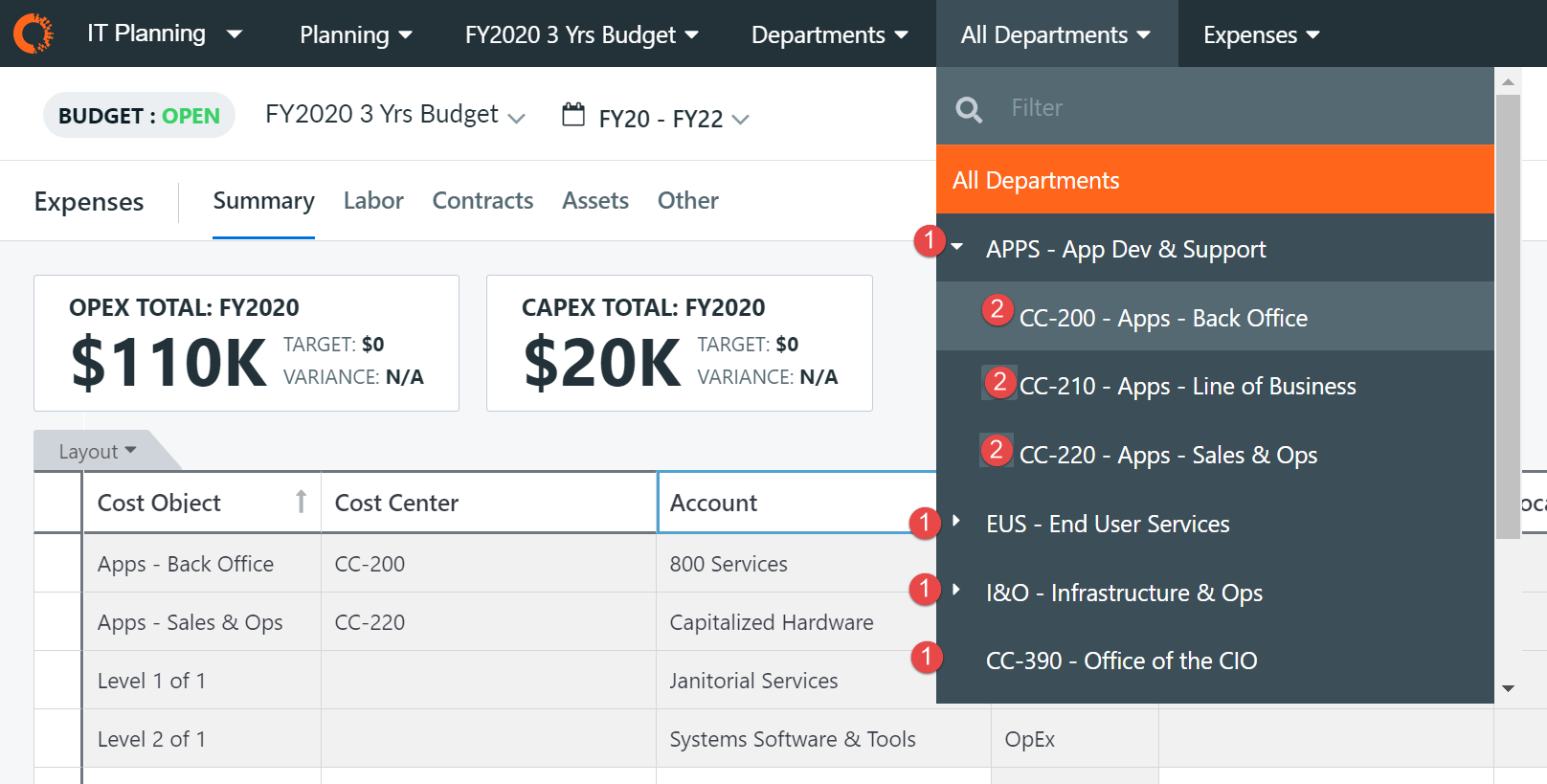 Figure 1: Level 1 and Level 2 values in IT Planning's "All Departments" drop-down list. 1 indicates Level 1 value while 2 indicates Level 2 value.