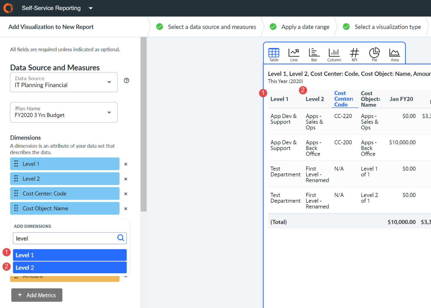 You can now select 2 new dimensions (Level 1 and Level 2) from the IT Planning data sources in Self-Service Reporting. The Level 1 and Level 2 are the top and next top level department roll-up associated with the line item's cost object. The Level 1 is the first list of departments that appear in the "All Departments" drop-down list in IT Planning while selecting the department to view the plan. The Level 2 is the second list of departments that would appear under the Level 1 in the "All Departments" drop-down list. This will allow the user to create a visualization that aggregates the plan for the executive and senior manager's department levels in order to produce executive reports.