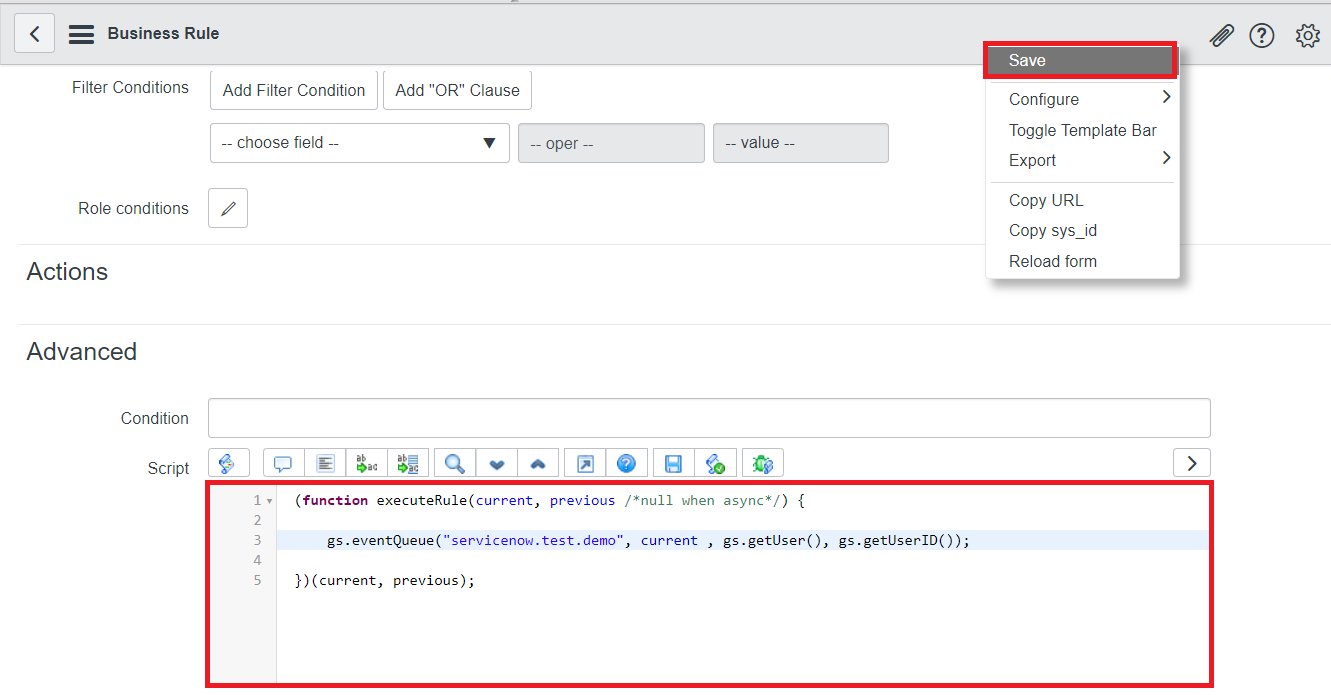 4. Now, go into the “When to send” tab. Now change the values like:- “send when:- Event is fired”, “Event name:- servicenow.test.demo” & then click on the Save button.