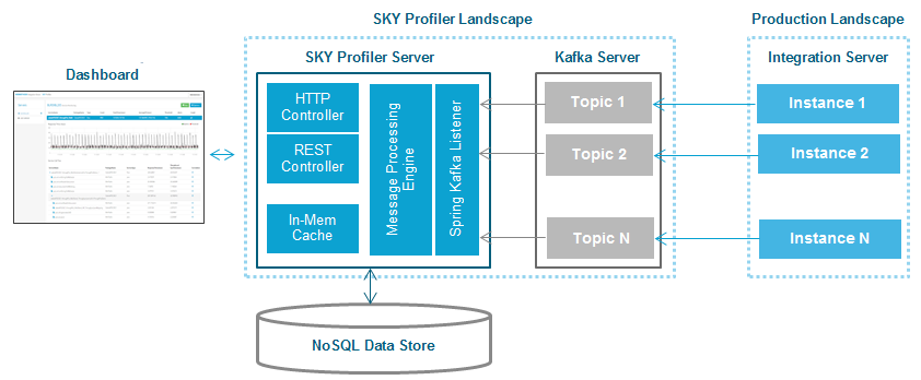 SKY Profiler is built using Server – Agent model. The agent is an IS package [SKYProfilerRuntime] which needs to be deployed on the IS that needs to be monitored. The Server component [SKYProfilerServer] can be deployed in a machine other than production instance of IS along with the database and messaging component (see Figure 1).