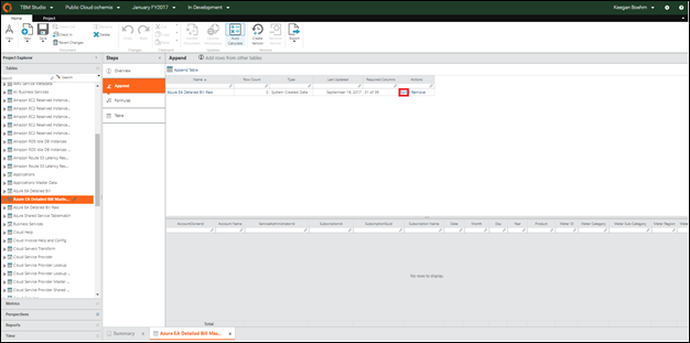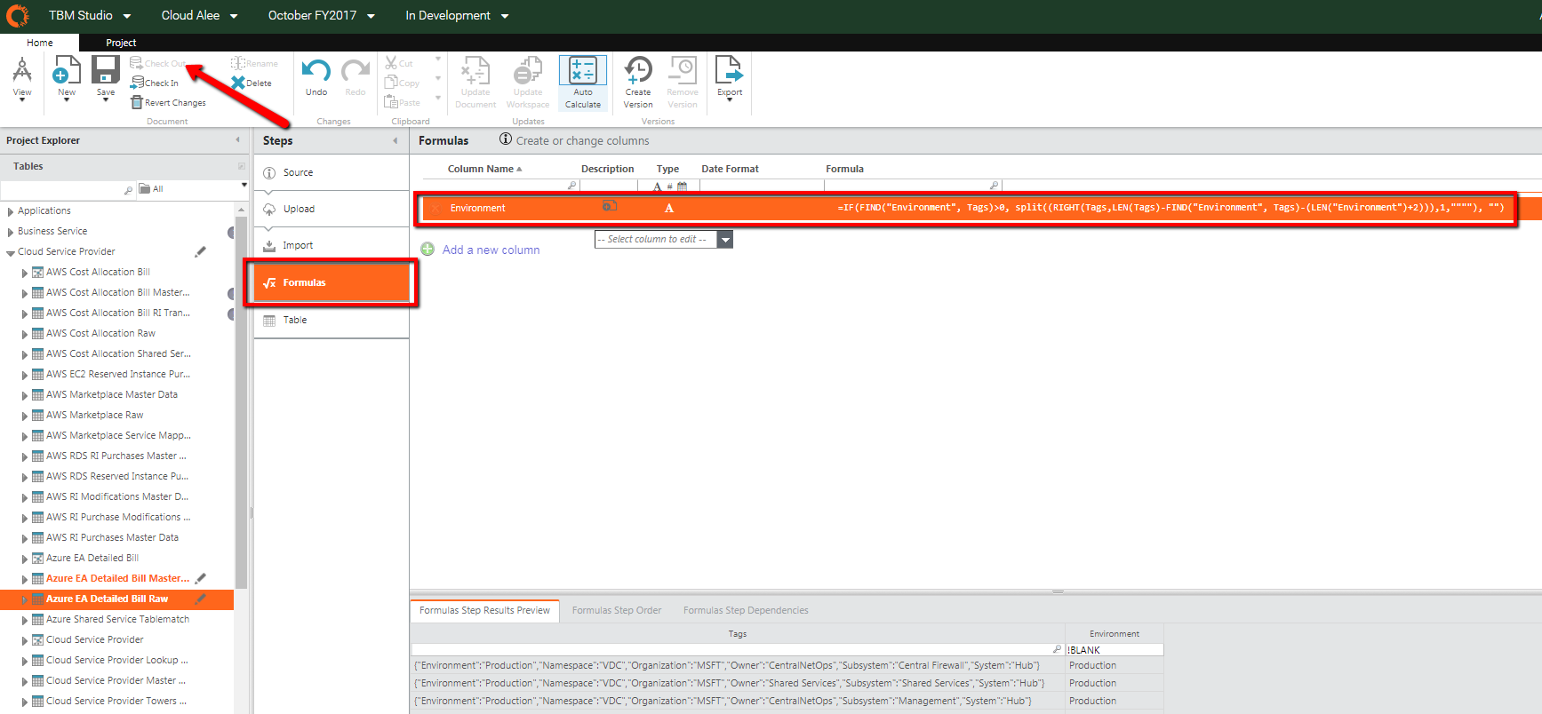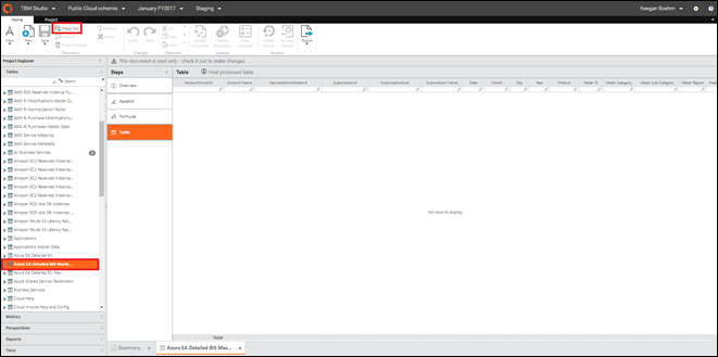 - Open TBM Studio in Apptio and select Azure EA Detailed Bill Raw. Click Check out.