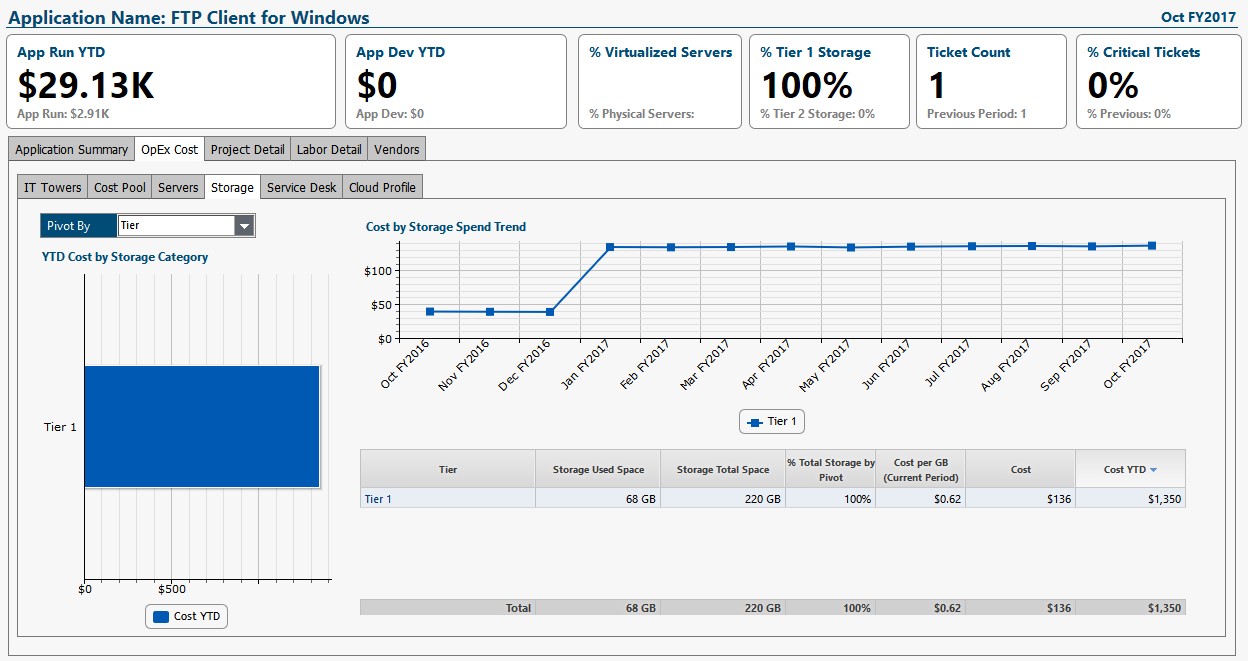 This is an application detail report for FTP Client for Windows, showing storage costs contributing to this application's total cost.