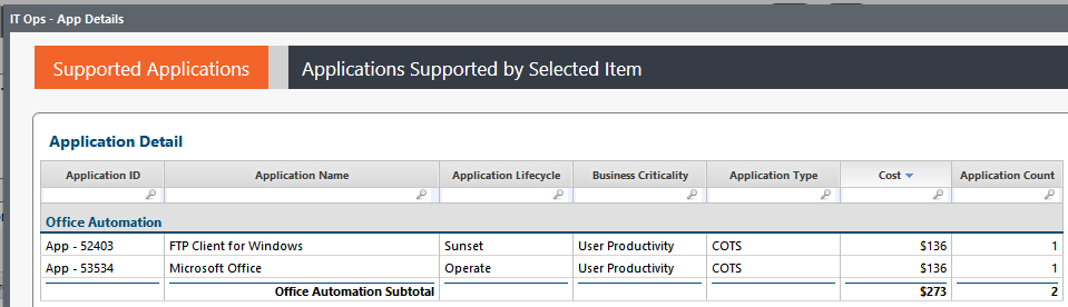 The app detail report table above is locked to two objects (Applications and Storage) but apparently it's just reading in the Storage Master Data.Storage Used Space column as-is, no matter how many apps this storage volume supports.