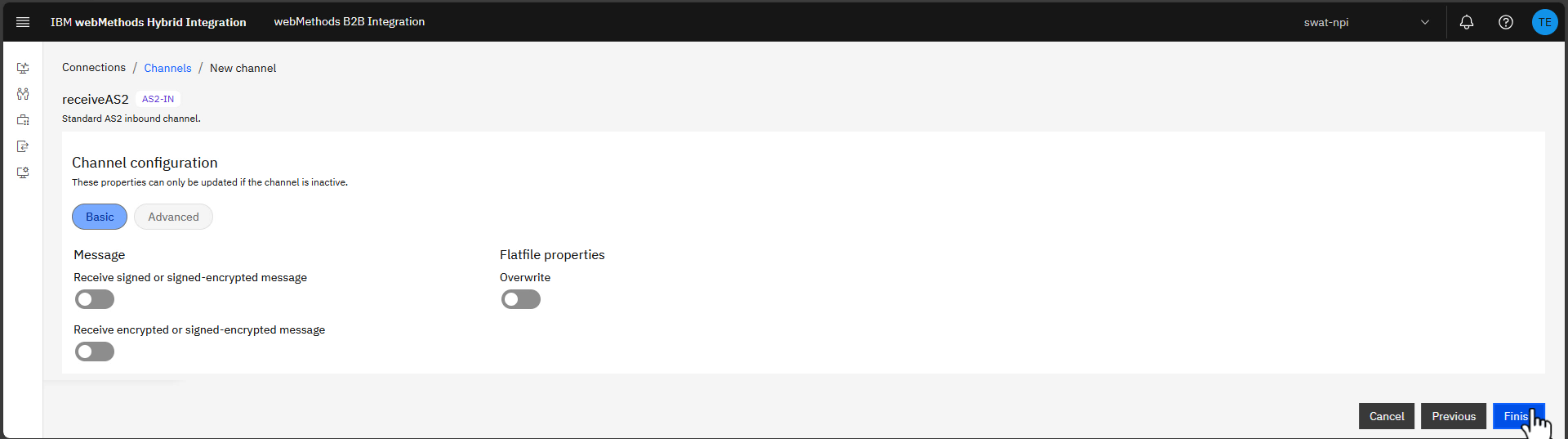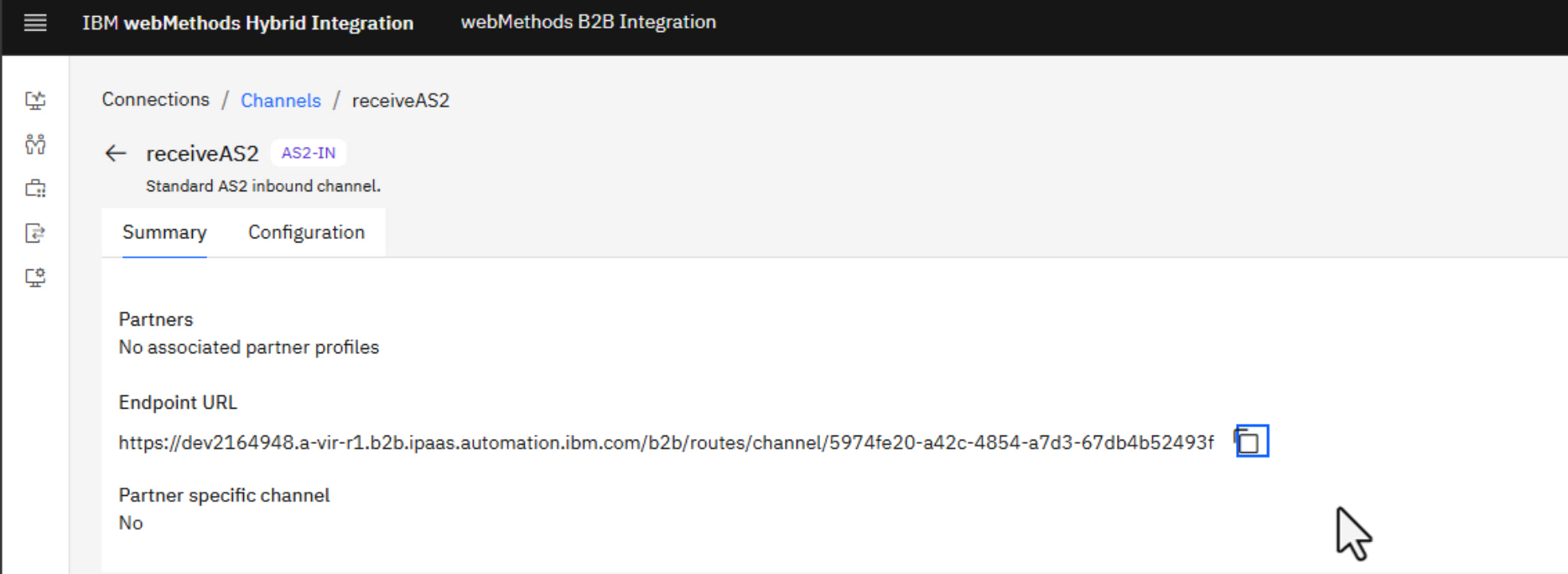 Channels represent communication links for transmitting documents between your Enterprise and your business partners. Channels can be partner-specific or shared.Here, we are creating a shared AS2-IN channel called receiveAS2.