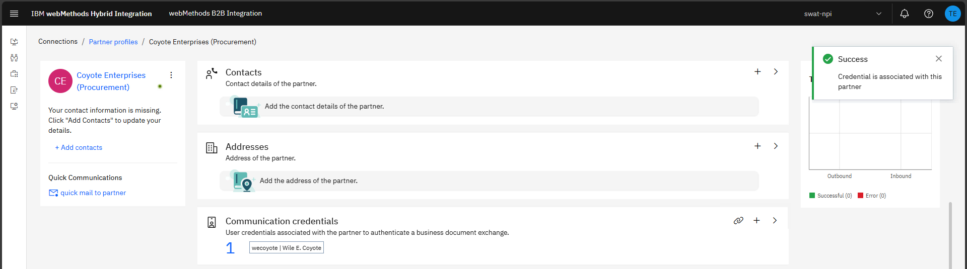 Communication credentials are the user accounts your partners will use to authenticate when sending documents. A partner must have at least one associated communication credential to send a document to the enterprise. You can also configure certificates for authentication, but for simplicity we will use basic authentication for this tutorial.