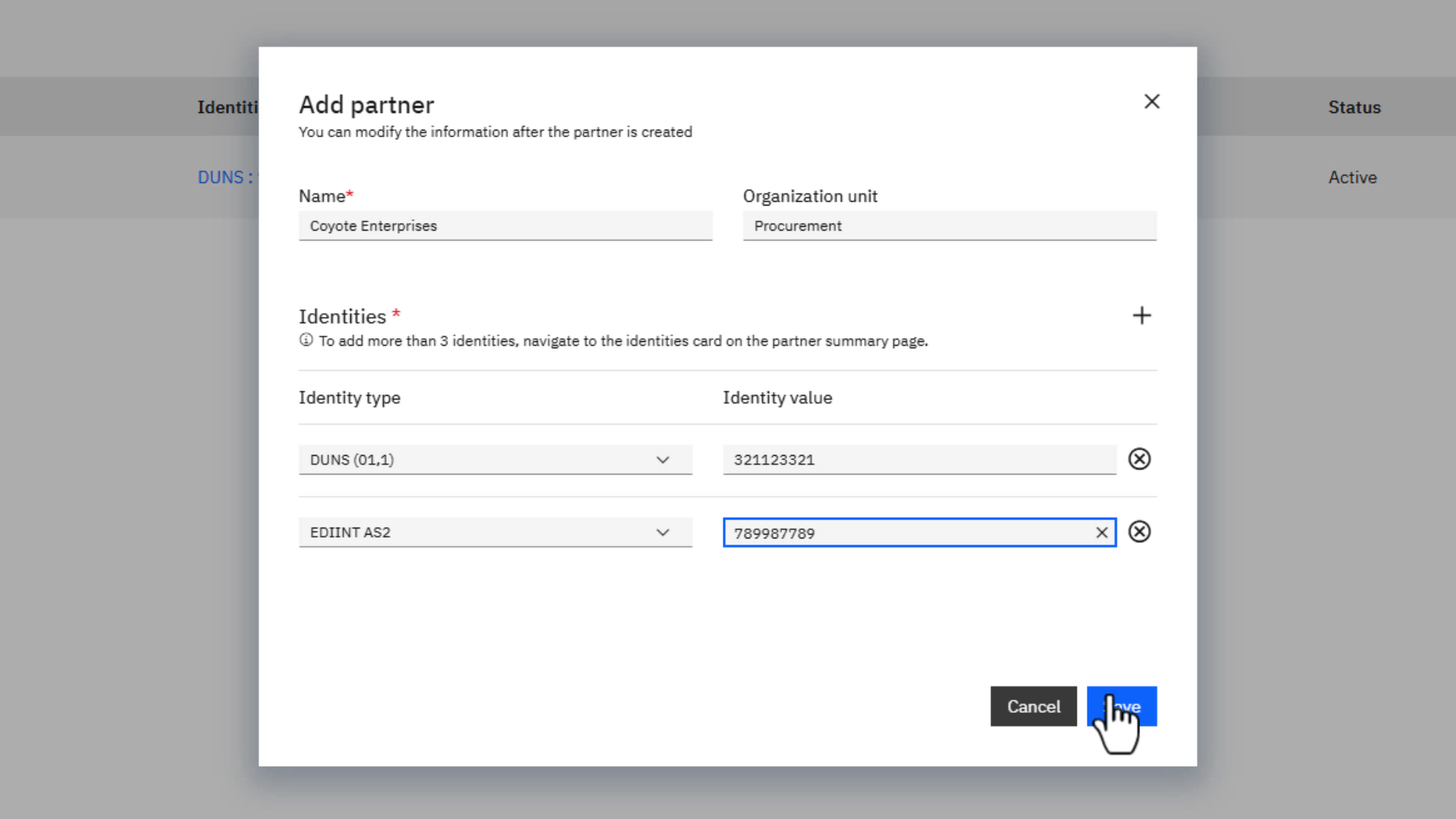 Here we are adding our partner, Coyote Enterprises, along with their DUNS number and AS2 ID.