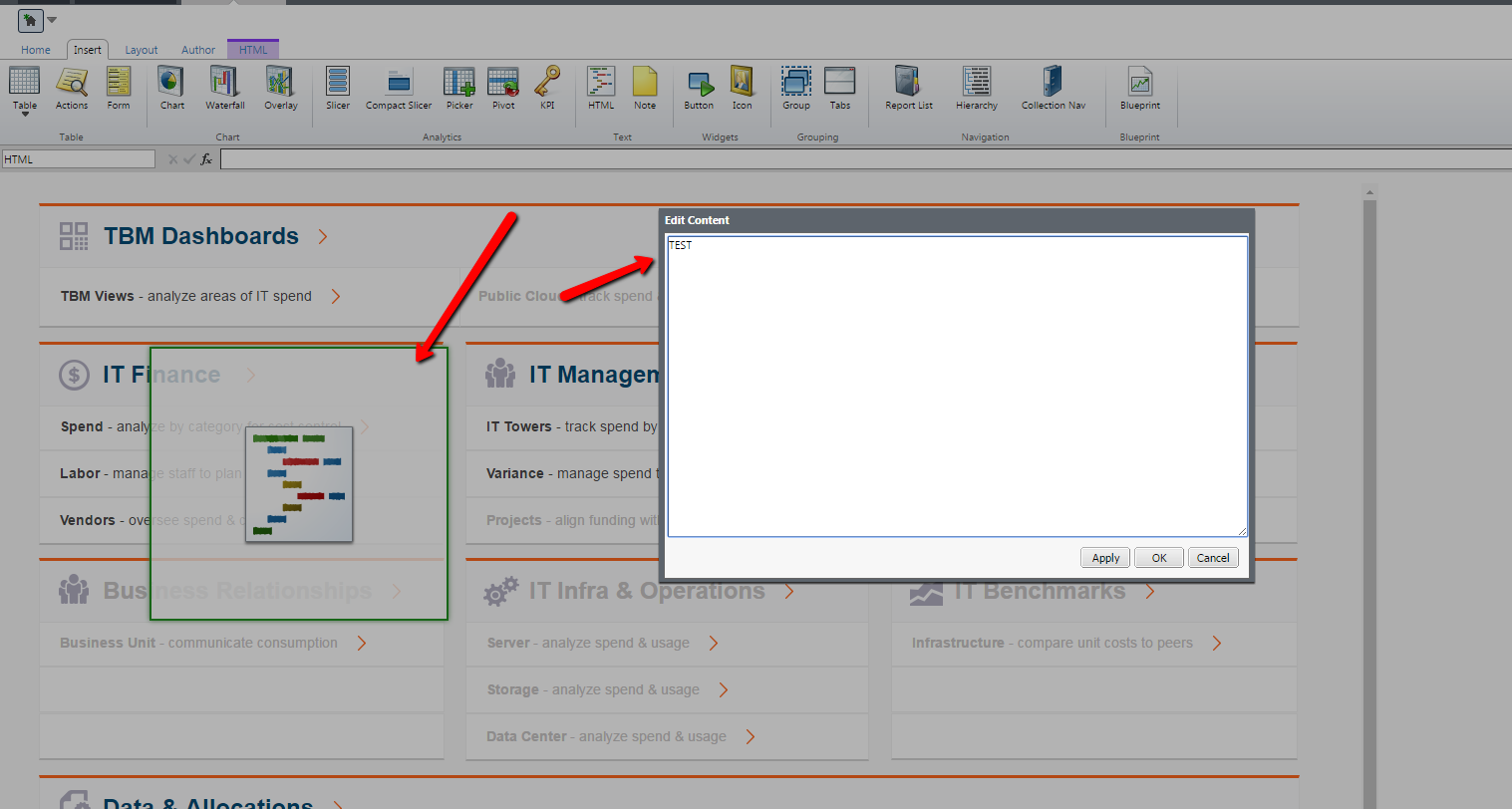 Application: Login messages are used to either notify/warn users of a particular pain point or message that should not be ignored. Traditionally, this can be done by editing the login message via Project Time Settings, but using an html object is just as effective. For this example there will be an html text overlay object on the Service Costing landing page when opening the project “Service Costing.” The message will say “TEST” to illustrate how the user would see end results.