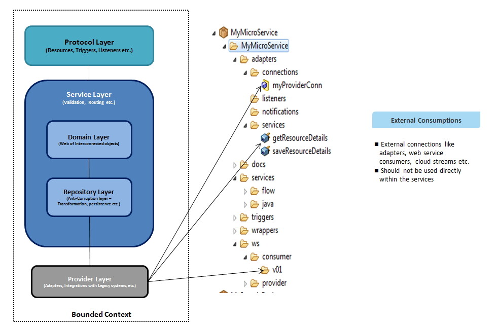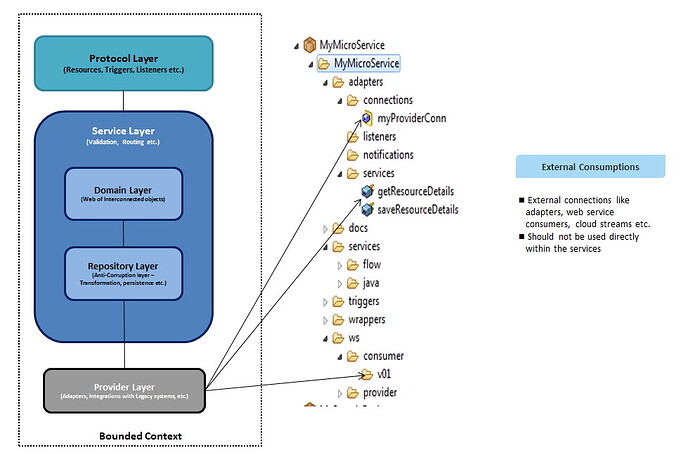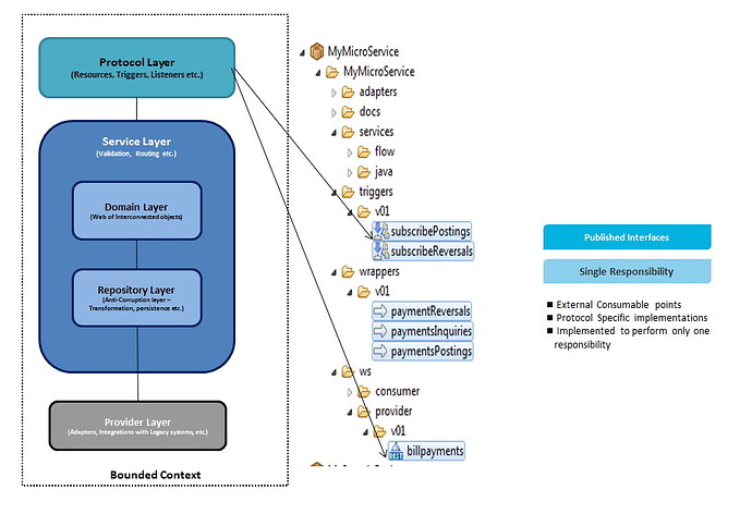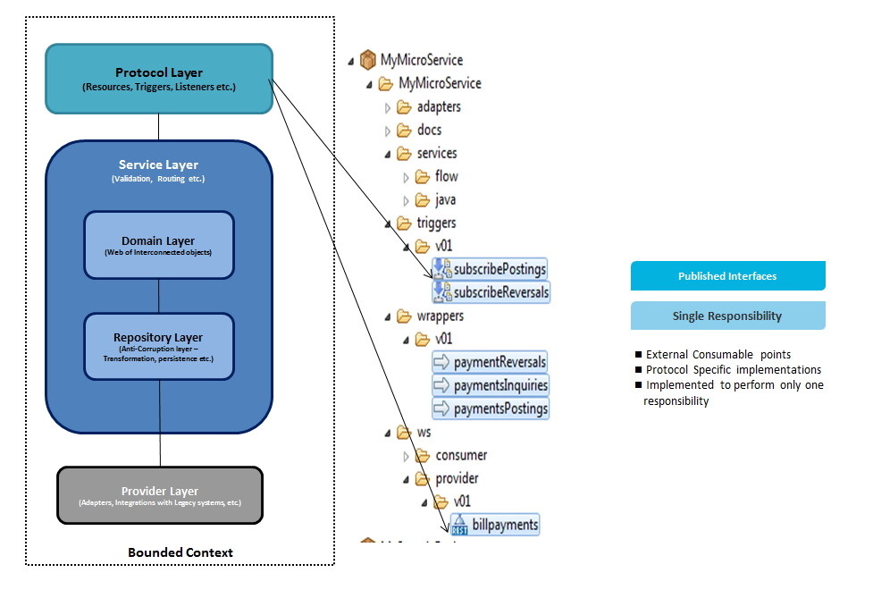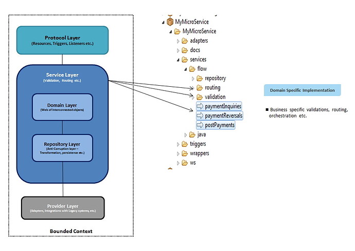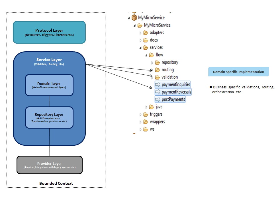 Service Layer: All the domain specific implementations for validation, orchestration, choreography with the provider systems or system micro services are implemented in this layer. This layer can use the Domain specific objects created in the docs folder (is called Domain Layer in the design diagrams). Any invocations to the backend systems (with JDBC, TCP adapters etc.) should be implemented via wrapper layer (repository layer) with a generic contract. This will help to makes the changes minimal within the Microservices in case of any changes in the provider systems.