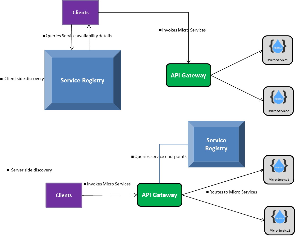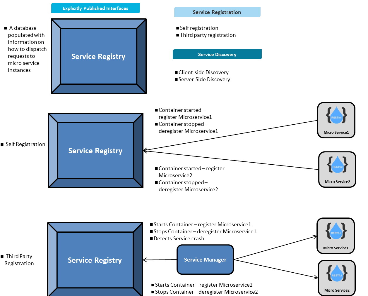 Now, how does the client discovers this microservice end point? there are few cases where clients would go for client side load balancers like Netflix Ribbon which is upto the clients consuming the microservices. But on the server side based on the Service Manager type a different discivery mechanism can be followed.